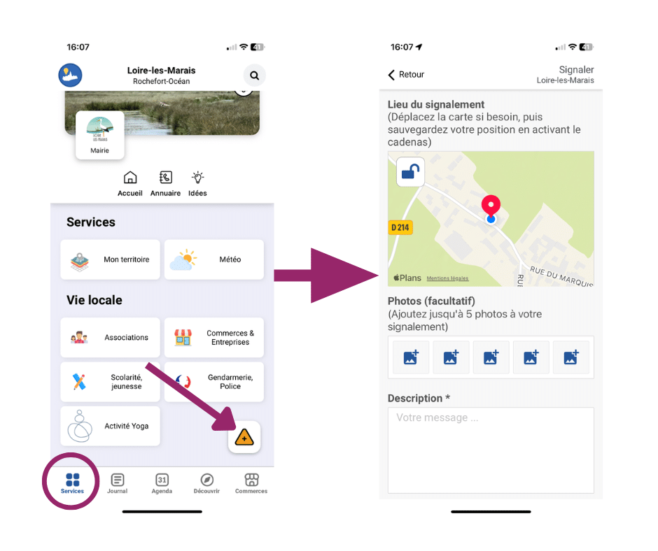 Simple et rapide, votre message est transmis en mairie et nous permet de suivre plus facilement les demandes et d’apporter une réponse adaptée. En quelques clics, vous pouvez localiser le signalement et ajouter une photo si besoin.